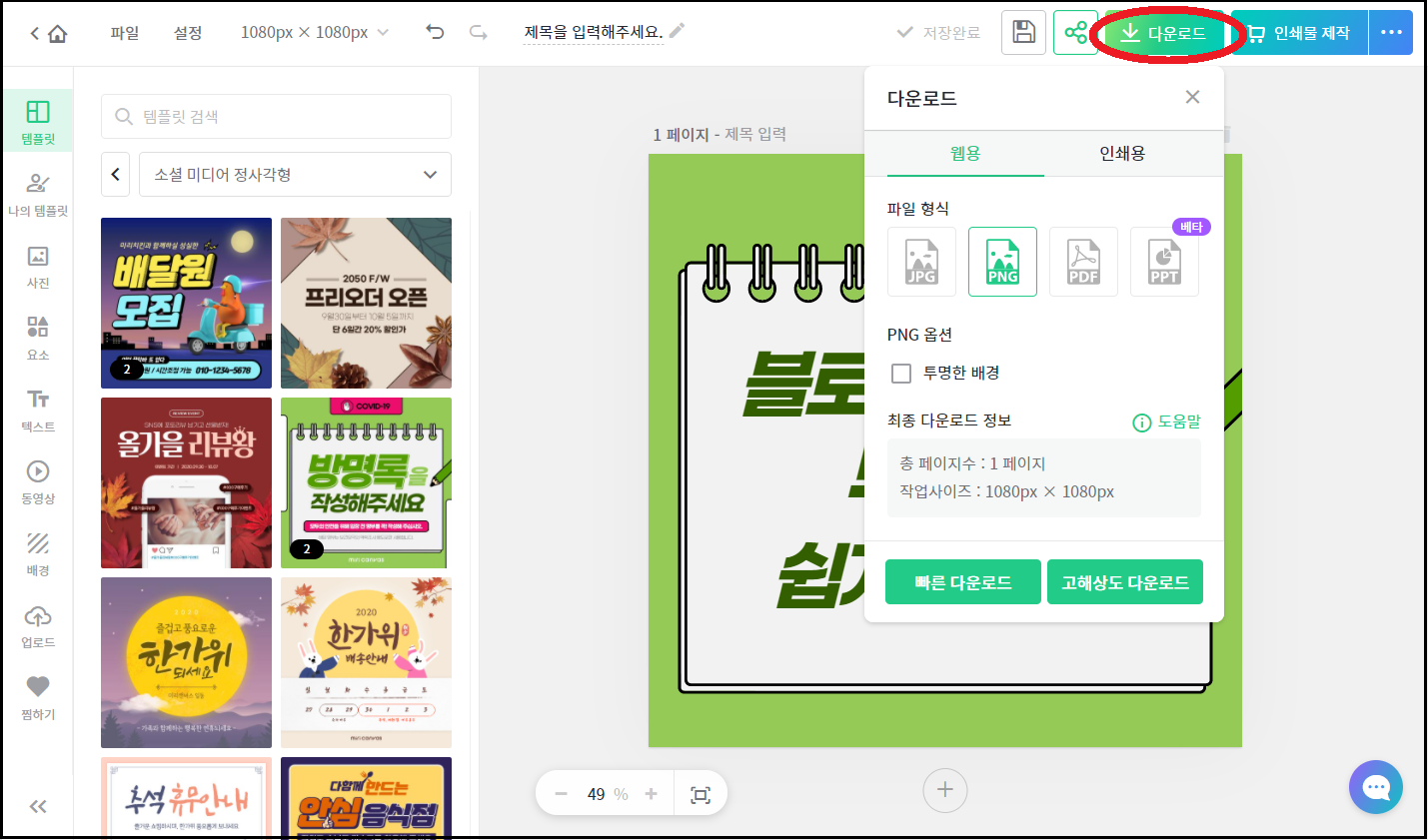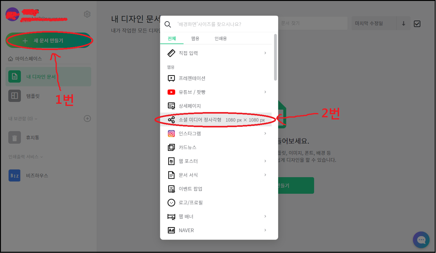 새문서만들기를 누른후 팝업이 뜨면 정사각형 썸네일을 만들예정이므로 소셜미디어 정사각형을 선택합니다.