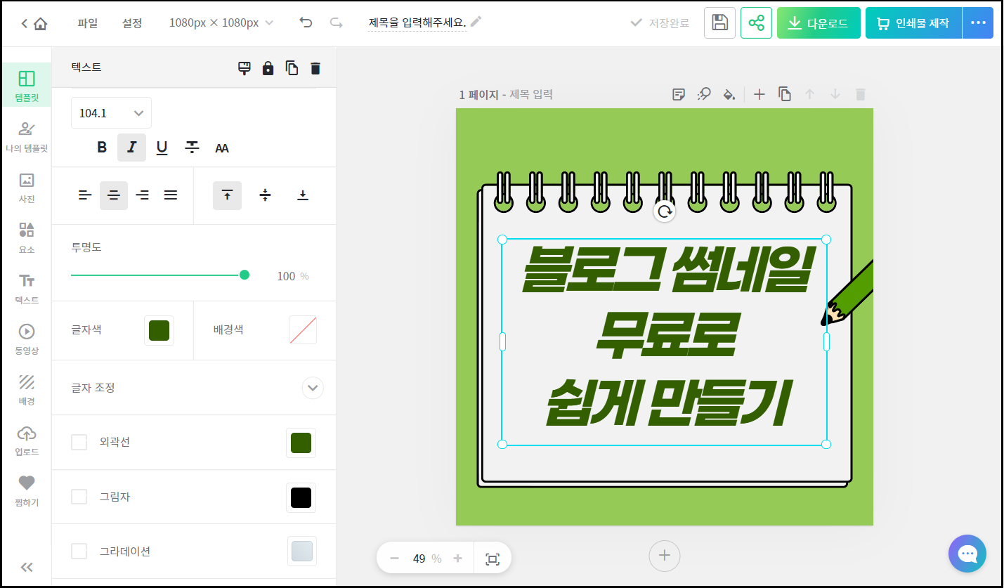 5에서 남겨놓은 "작성해주세요" 글자를 "블로그 썸네일 무료로 쉽게 만들기" 로 수정,위치조정 완료합니다.