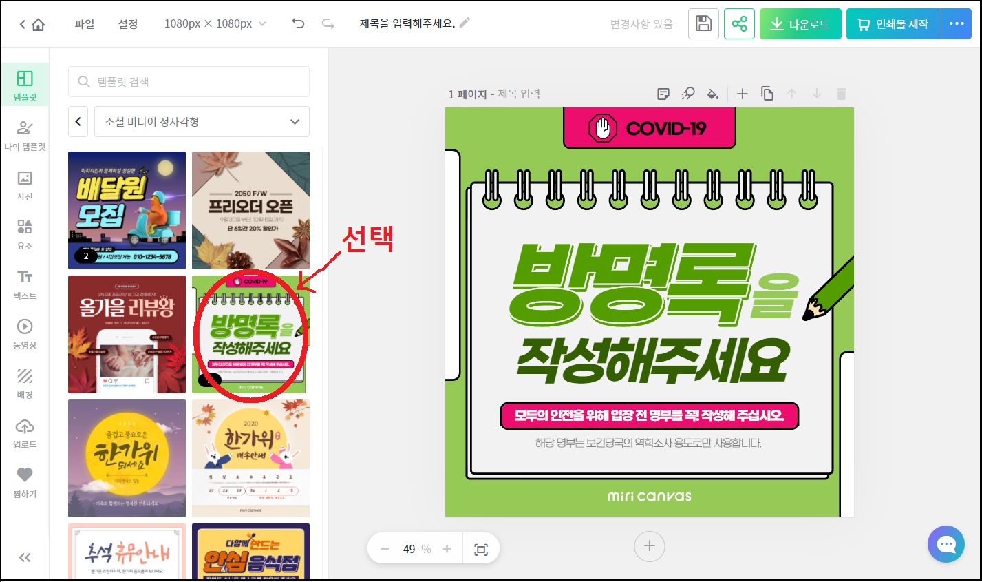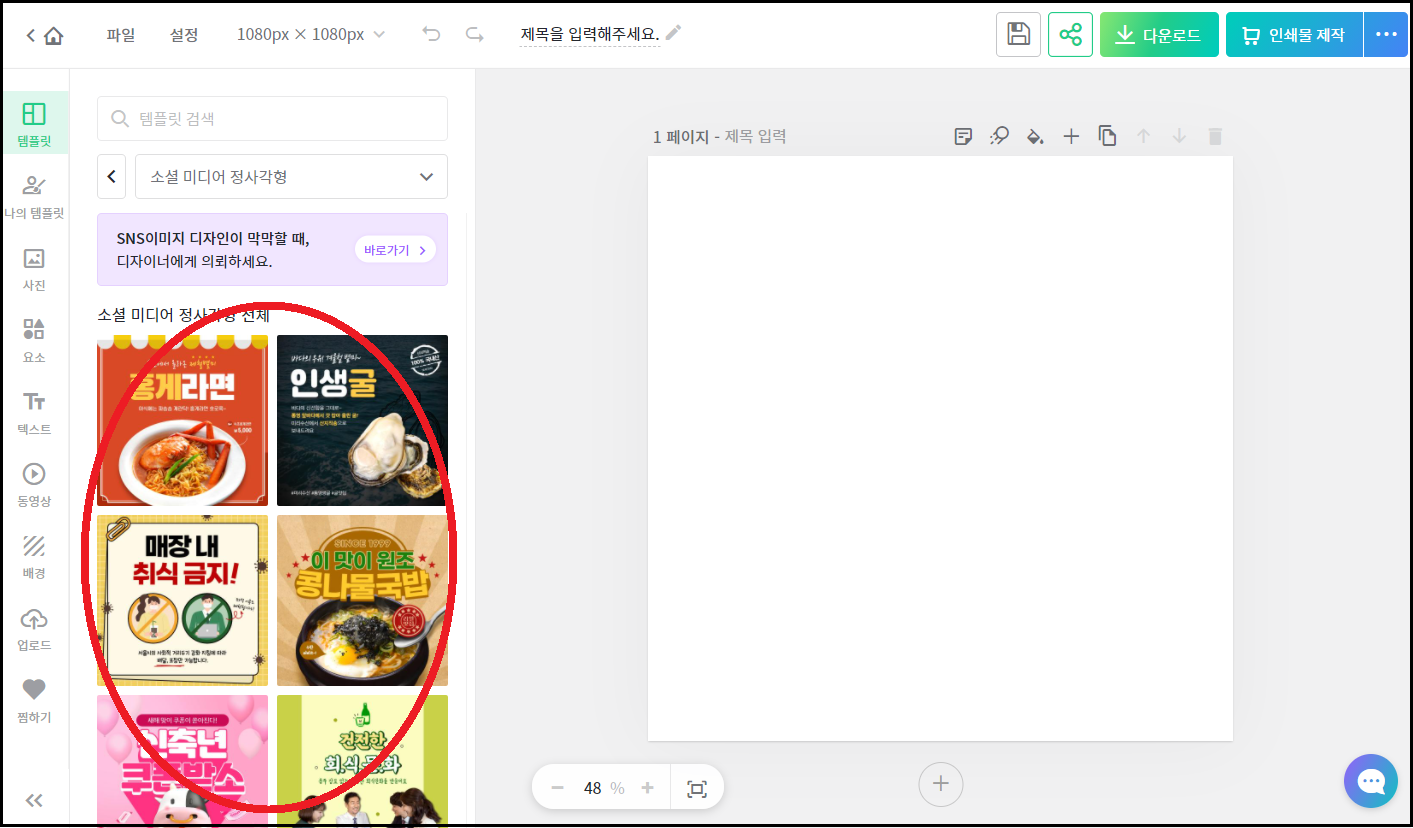 3. 소셜미디어 정사각형중 미리캔버스에서 제공하는 템플릿을 확인합니다.