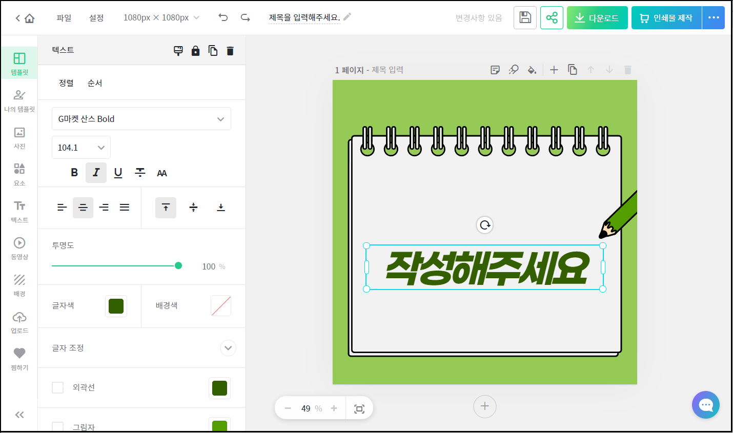 "작성해주세요" 글씨 부분 이외에 사용하지 않을 그림이나 글씨는 선택후 삭제합니다.